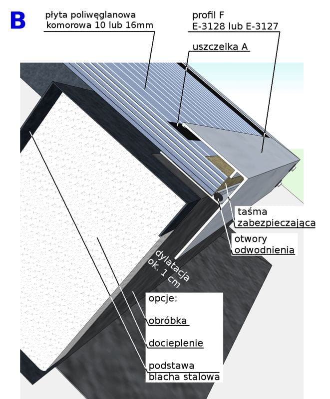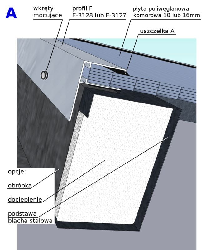 - system stolarki aluminiowej surowej wraz z wypełnieniem z płyty poliwęglanowej 16mm 2UV